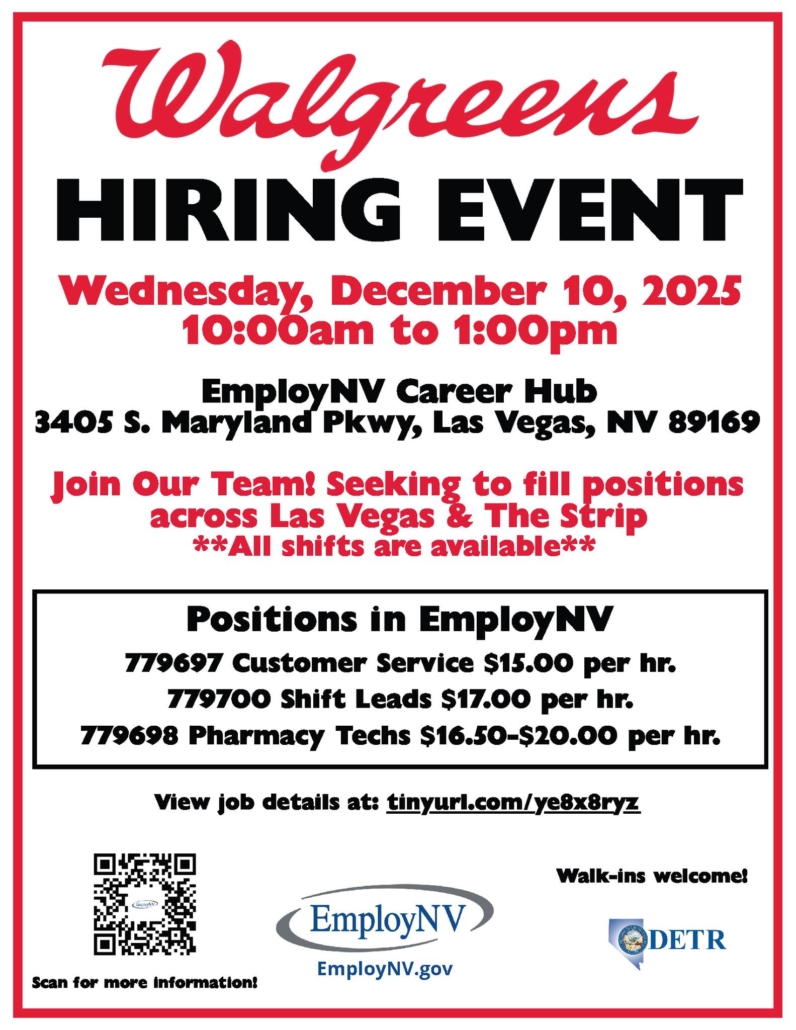 Interview on Wednesday, December 10, 2025 from 10am-1pm at EmployNV Career Hub,3405 S. Maryland Pkwy, Las Vegas, NV 89169