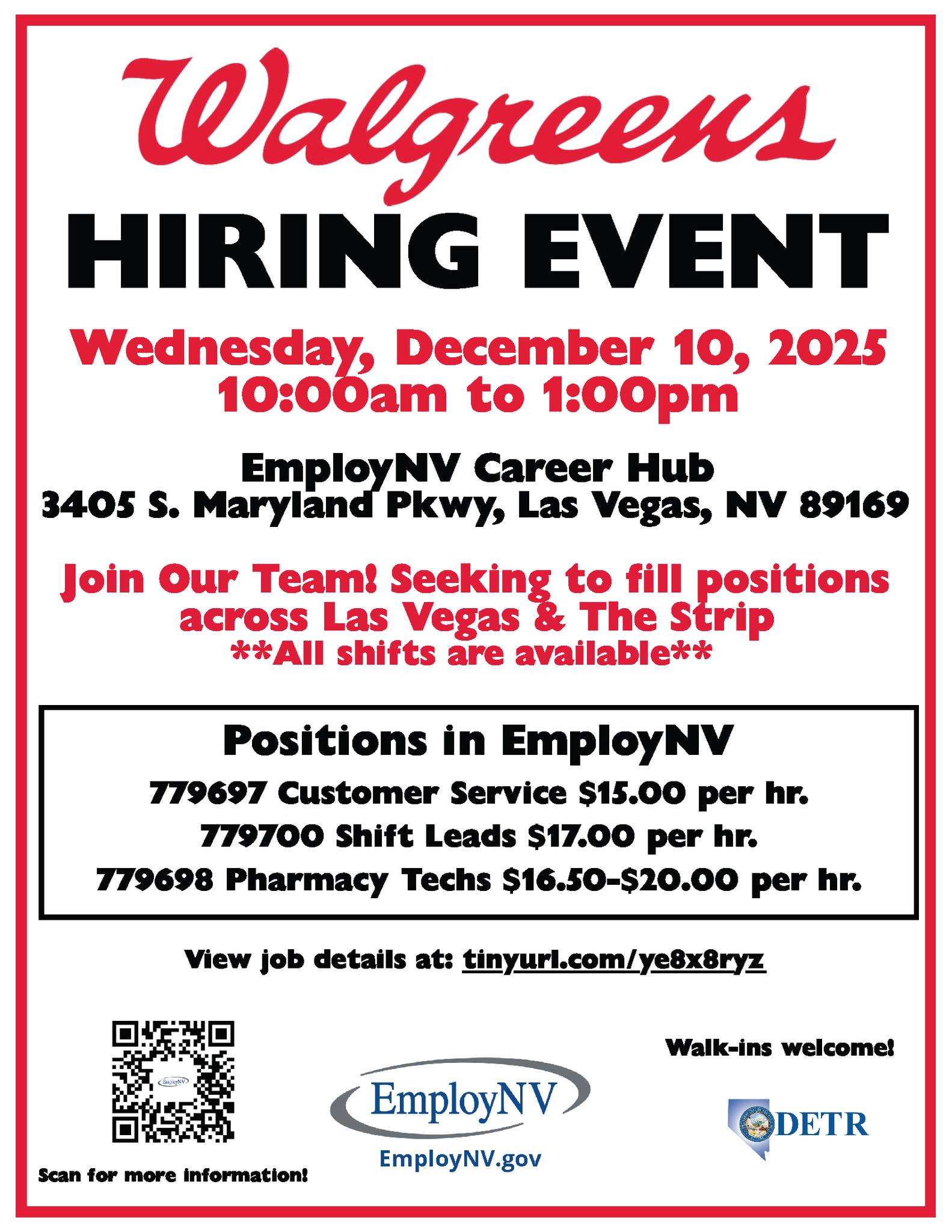 Walgreens is hiring for Customer Service, Shift Leads, & Pharmacy Techs paying $15-$20 hourly – all shifts available for stores across LasVegas & The Strip.