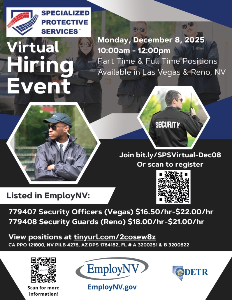 Join the Specialized Protective Services Virtual Hiring Event on Monday, December 8, 2025 10am-12pm and explore rewarding careers in public safety and protection throughout Las Vegas. Full + Part time $16.50-$22.00/hour